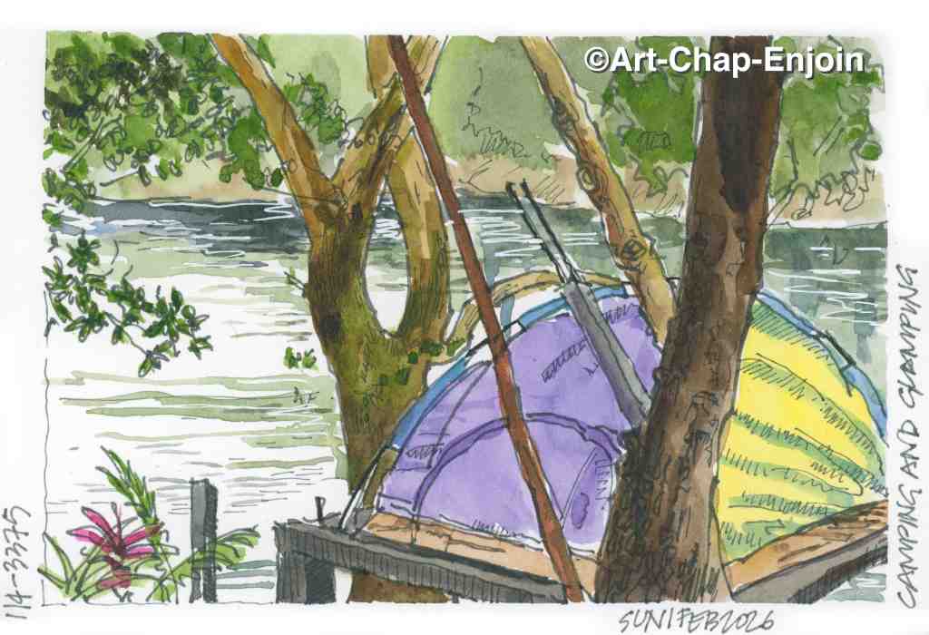 Here is the first sketch I did when we went camping at Isla Del Antoño, Cavinti, Laguna. We got up at 5am and our friend kindly drove us for 3 hours. Then we took a little motor boat to this island to camp. My sketch is of our friends (rented) tent…which was pitched (by the guys at the resort) on a concrete slab overlooking the lake. We pitched ours (our ancient Hilleberg tent which we bought when in Bhutan – but that is still in good shape) on the shore – which seemed like a more normal way to pitch a tent to me. The campsite has toilets and a kitchen, so it was pretty easy camping.