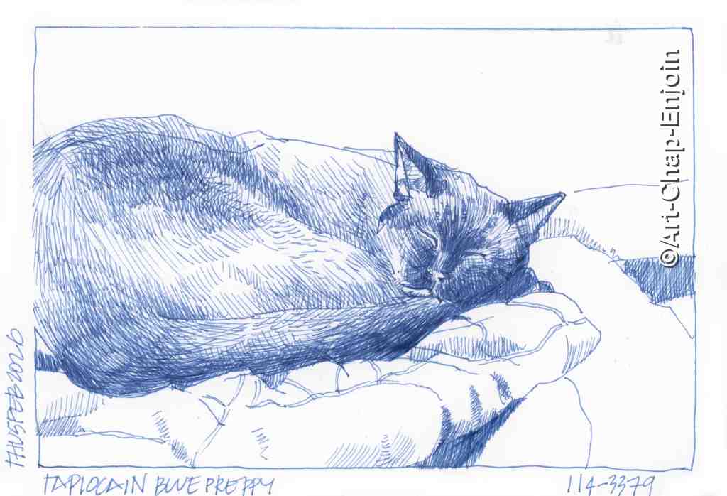 Here are two sketches of our cats, done with my new Platinum Preppy pen, using the cartridge of blue ink that came with the pen.
