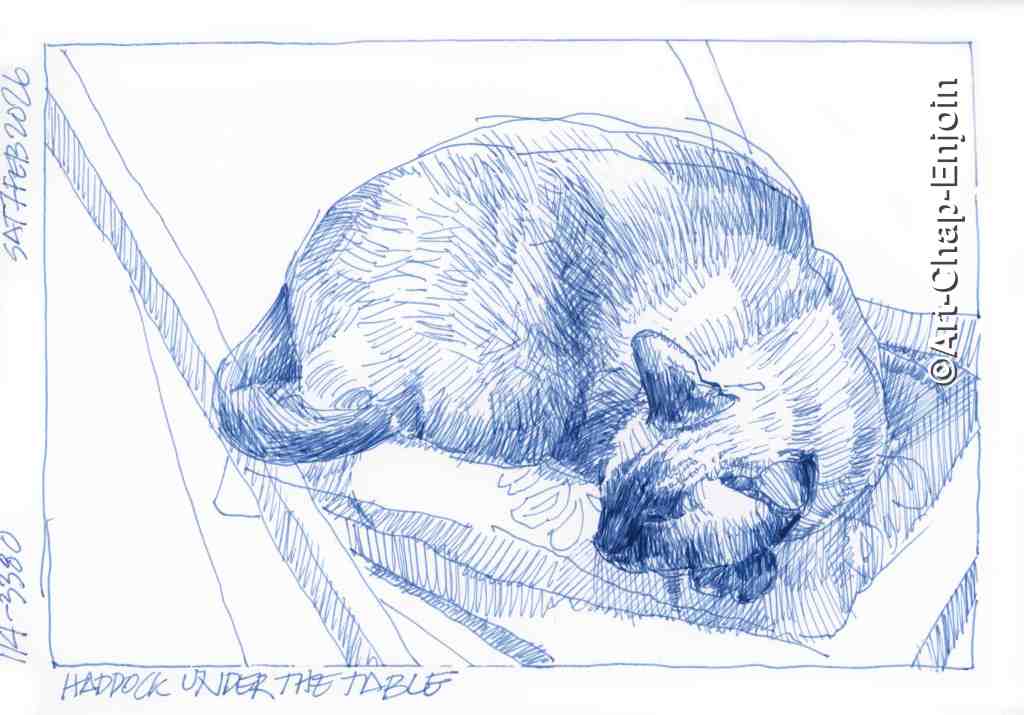 For this sketch I was just doodling around in the evening. This plastic bin holds our collection of freebie (mostly BDO) umbrellas, several of which we haven’t even opened! The whole thing only avoids falling over because the an ancient heavyweight socket-set (something I used in the UK when I actually did a tiny bit of car maintenance) at the bottom (why we still have that I don’t know).