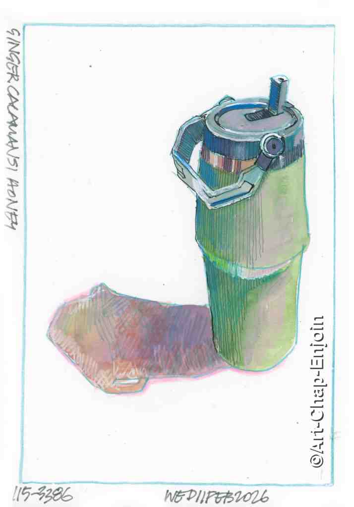 Recently I have been drinking hot fresh ginger, calamansi and honey to keep my itchy throat and allergy induced sneezing at bay. This cup (which I’ve sketched before of course – see No.2929), keeps it nice and hot for hours.