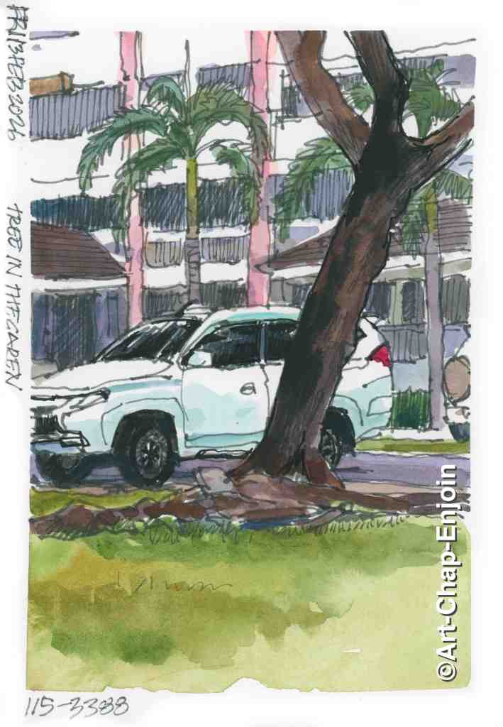 I finally got outside to sketch…around this time I was busy with work and had been doing too many evening/indoor sketches. Many of the trees in the communal garden look like they are about to fall over with their roots lifting out of the ground. I am dreading the next big typhoon to hit Metro Manila.