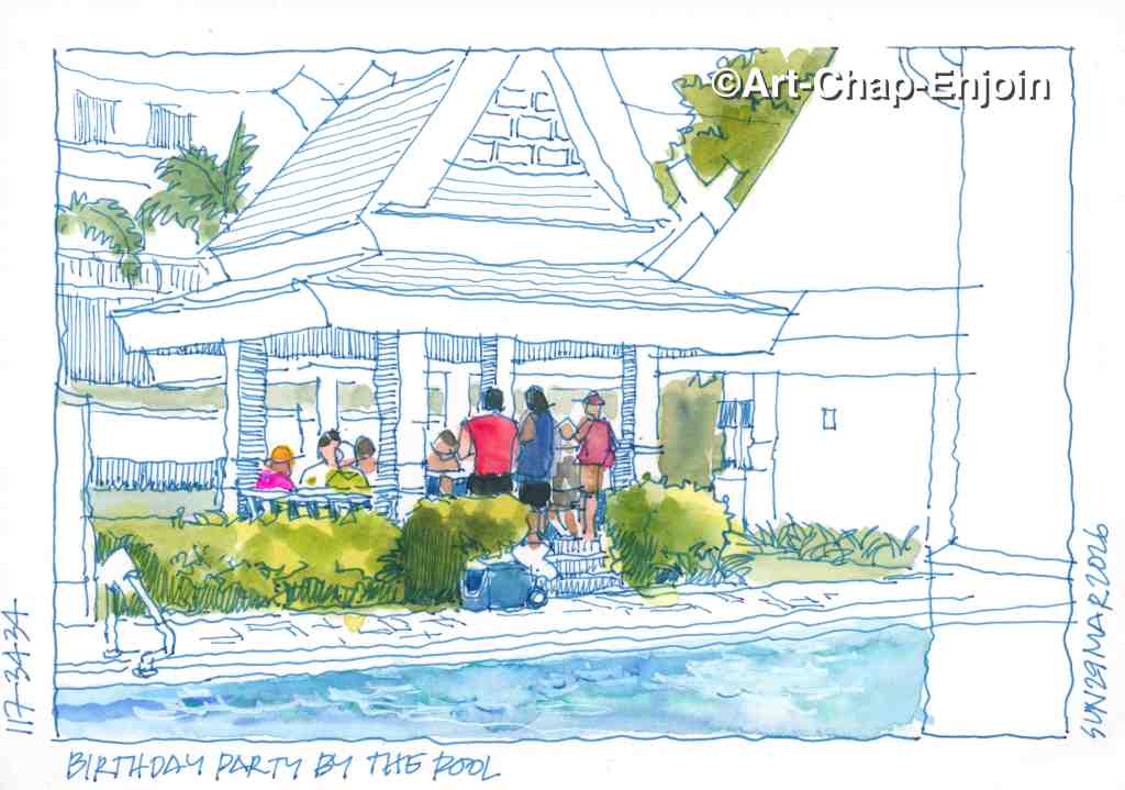 On this Saturday we began our day visiting one of the sponsors of our wedding and an old friend of my father-in-law. Sadly he is terminally ill and slept through our visit. Afterwards we stopped by memorial park then had lunch at SM BF homes. When I started this sketch there were four people at the table – then they all got up and left!