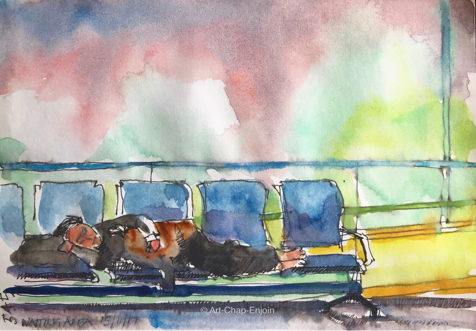 I am travelling again – just for a few days to Hanoi. Here is a sketch done late at night at the airport on my way. Someone decided to really relax while waiting at the departure gate.