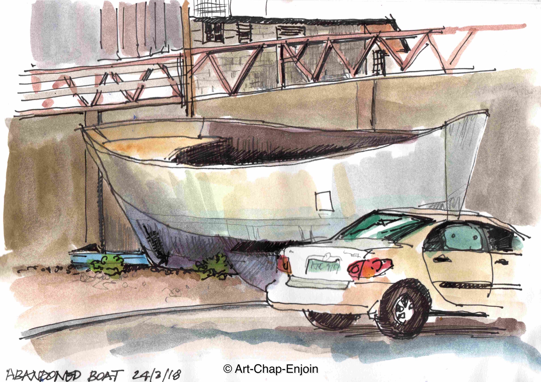Yesterday at my daughters gymnastics club, I went outside and drew this for a change. This boat sits mouldering away in the car park…we’ve often wondered why it’s there…an intriguing mystery!
