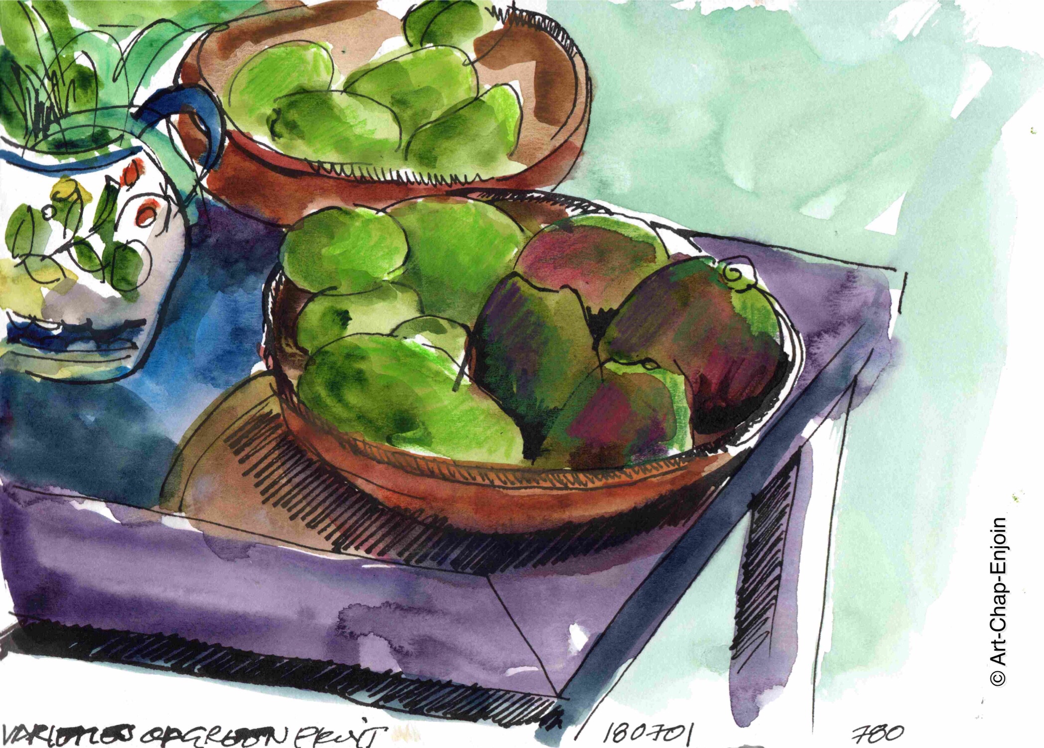 Yesterday I got a belated present – a Sailor Fude bent nib fountain pen. The bent nib means the line thickness can vary – and they are rather fun to draw with! This is my first drawing for World Watercolor Month…not following the prompt though (green mangoes, avocados and somewhere in there, a green orange!)