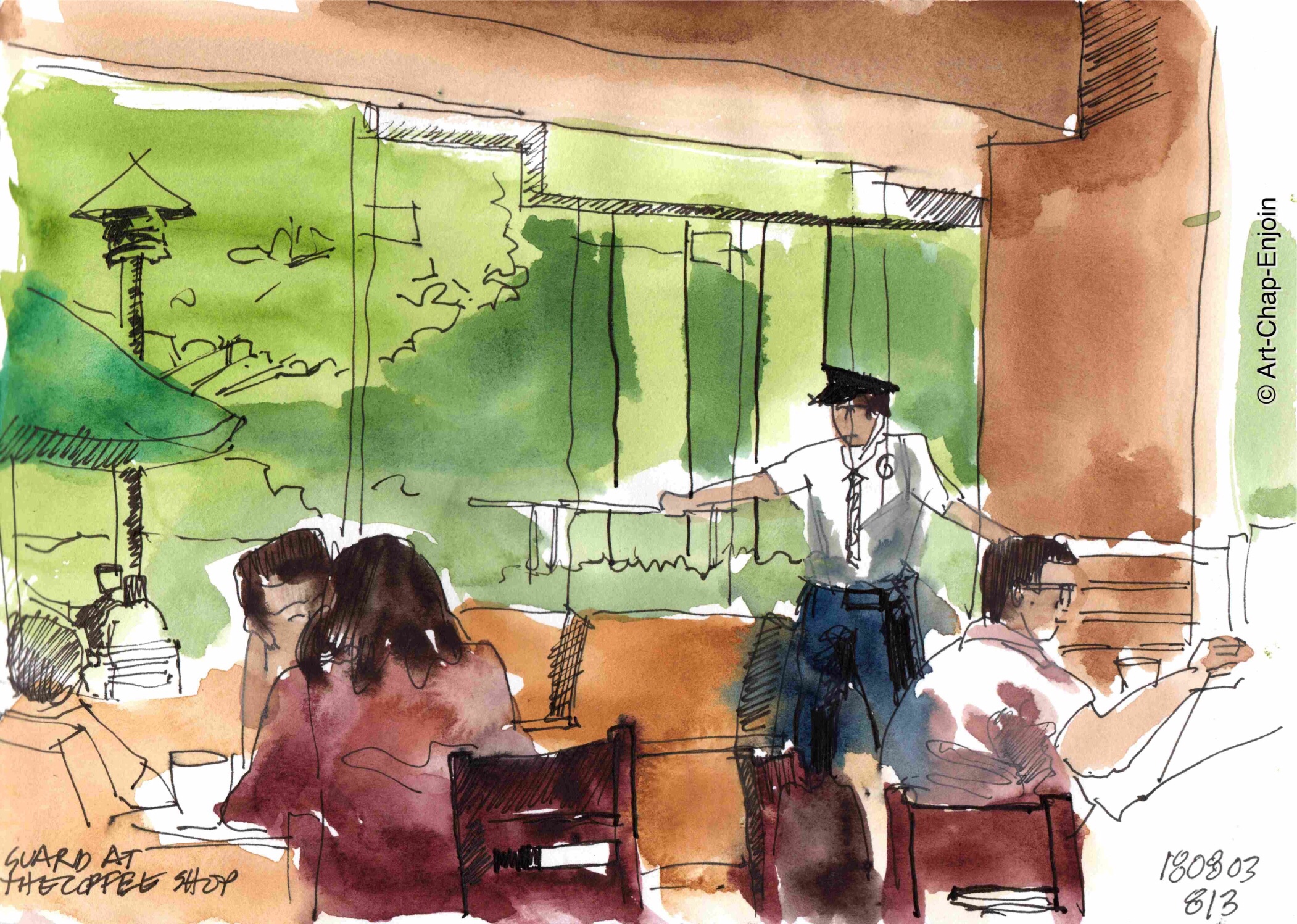 I discovered a new coffee shop where I go shopping – naturally I took some time to do a sketch. It’s all brown and coffee coloured inside…nice, green and bright in the seating area outside.