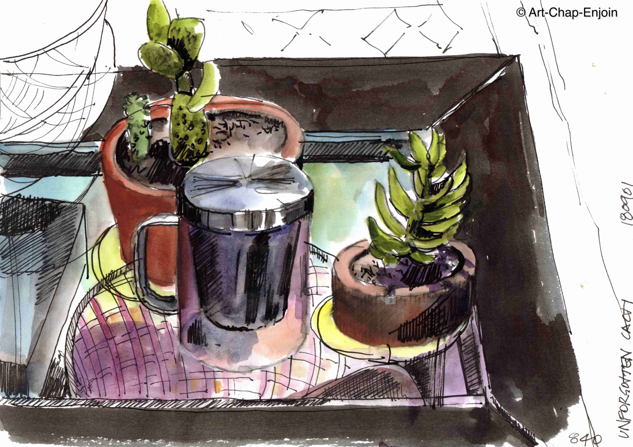 Here is a little evening doodle done while we were binging on the “Unforgotten” crime series. These are my daughters cacti – at least the ones that survived while we were on holiday.