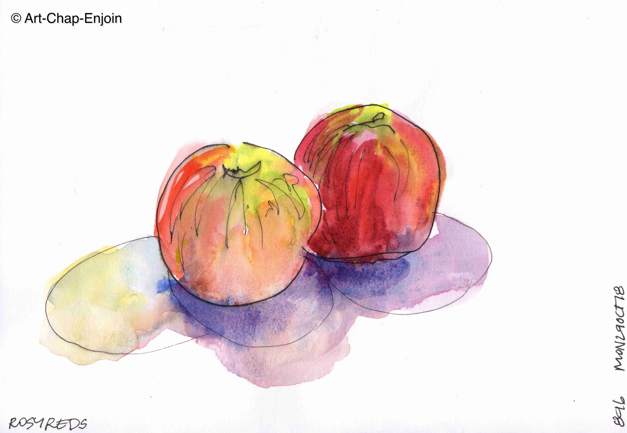 Keeping up doing at least one sketch a day sometimes means I have to do something quick and simple like this. Just some apples – and some fun with watercolours.