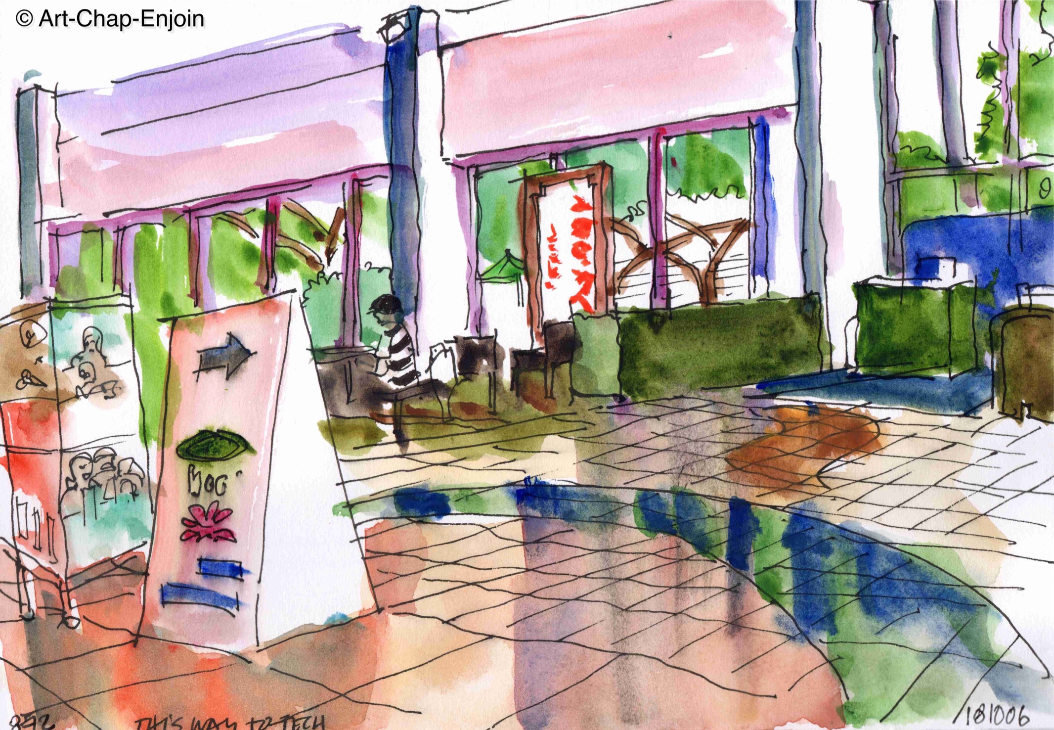 Here is the sketch I did yesterday at the mall – a bit of a disaster as my perspective is all wonky as are the colours. Never mind.