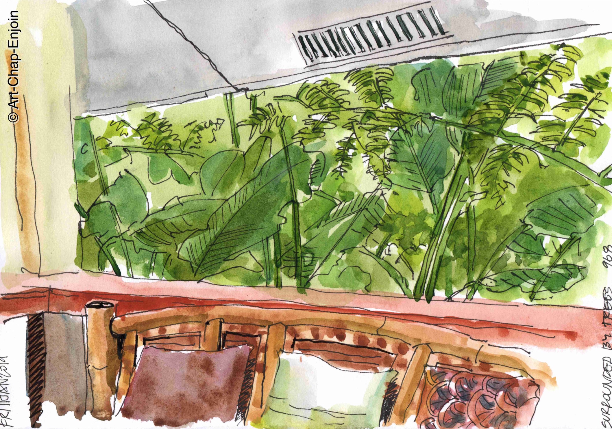 Over the weekend the whole extended family (about 30 of us) headed out to an Airbnb cottage Tanay, Rizal Province . This is the first sketch I did during the trip, sitting on the big covered terrace. The cottage was buried in amongst verdant tropical greenery – and was lovely and cool at night being fairly high up in the mountains.