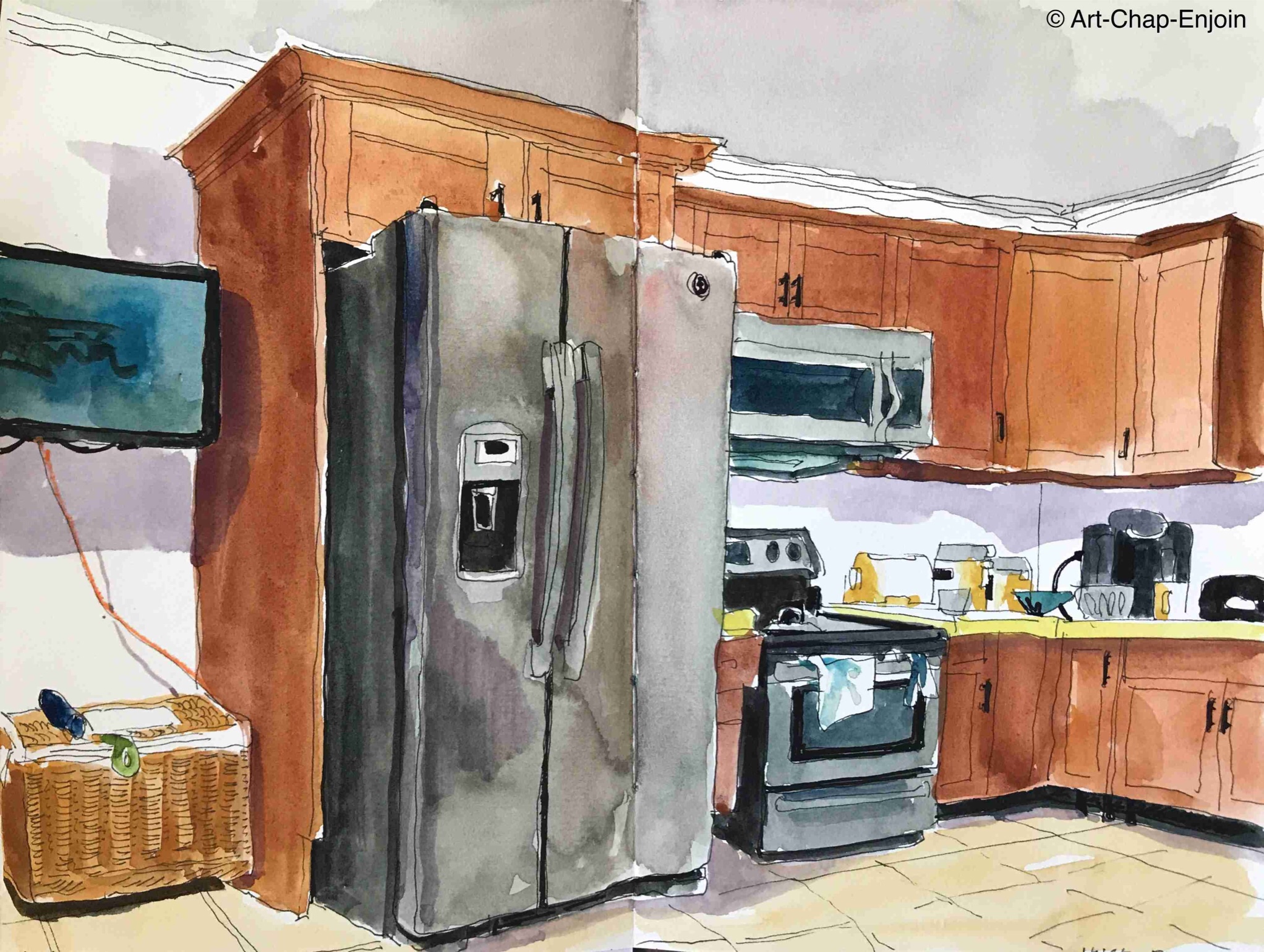 Here is an evening-time doodle done in the apartment I rented in Providenciales. The room is dominated by the enormous fridge.