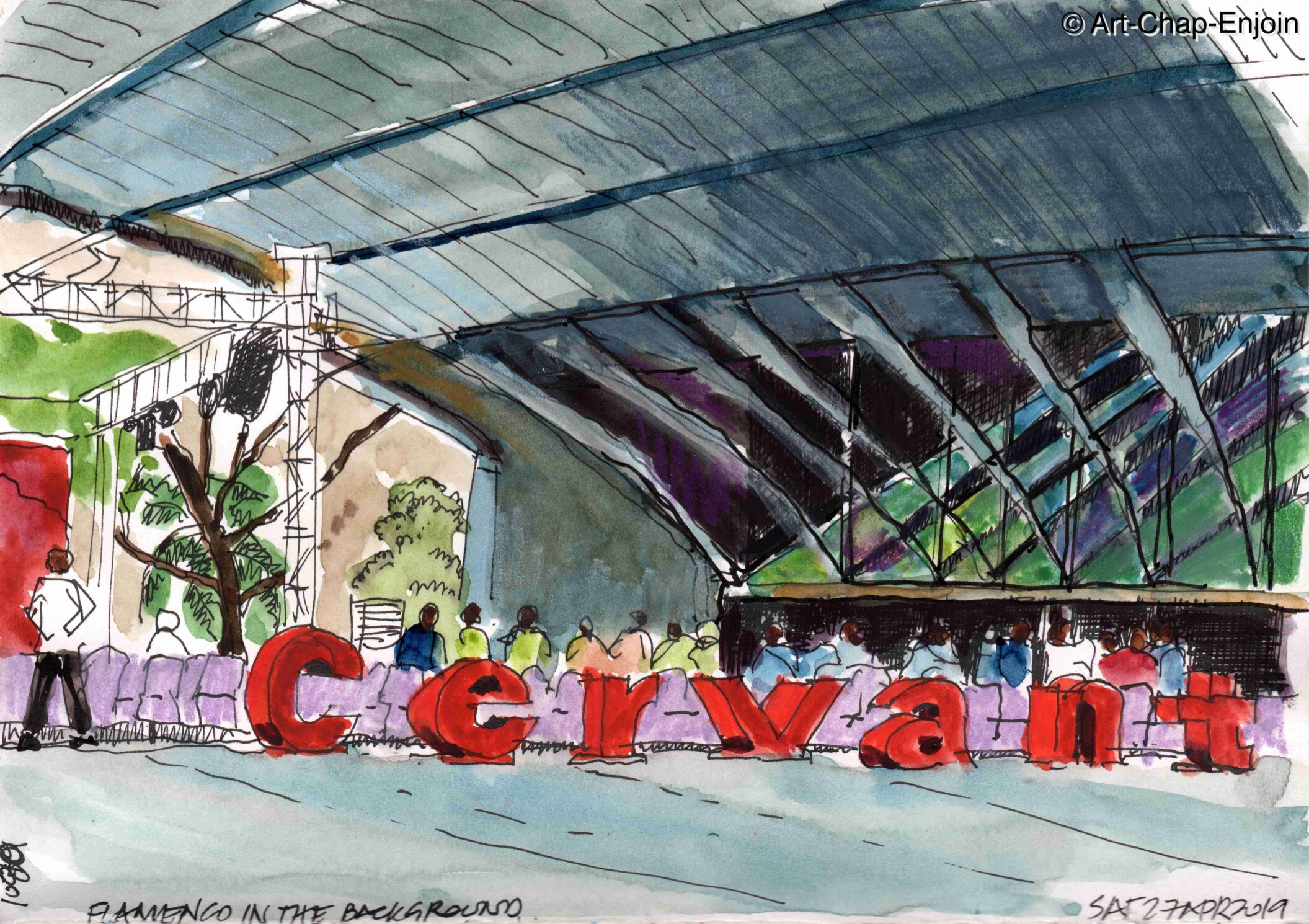 Here is my second sketch done at the Dia del Libro event at Ayala Triangle last Saturday, with Urban Sketchers Kyusi. Under the big arch of the Philippine Stock Exchange building there was a stage set up and while I was sketching this a flamenco guitarist was playing. The lettering is supposed to say Cervantes of course… I just ran out of space.