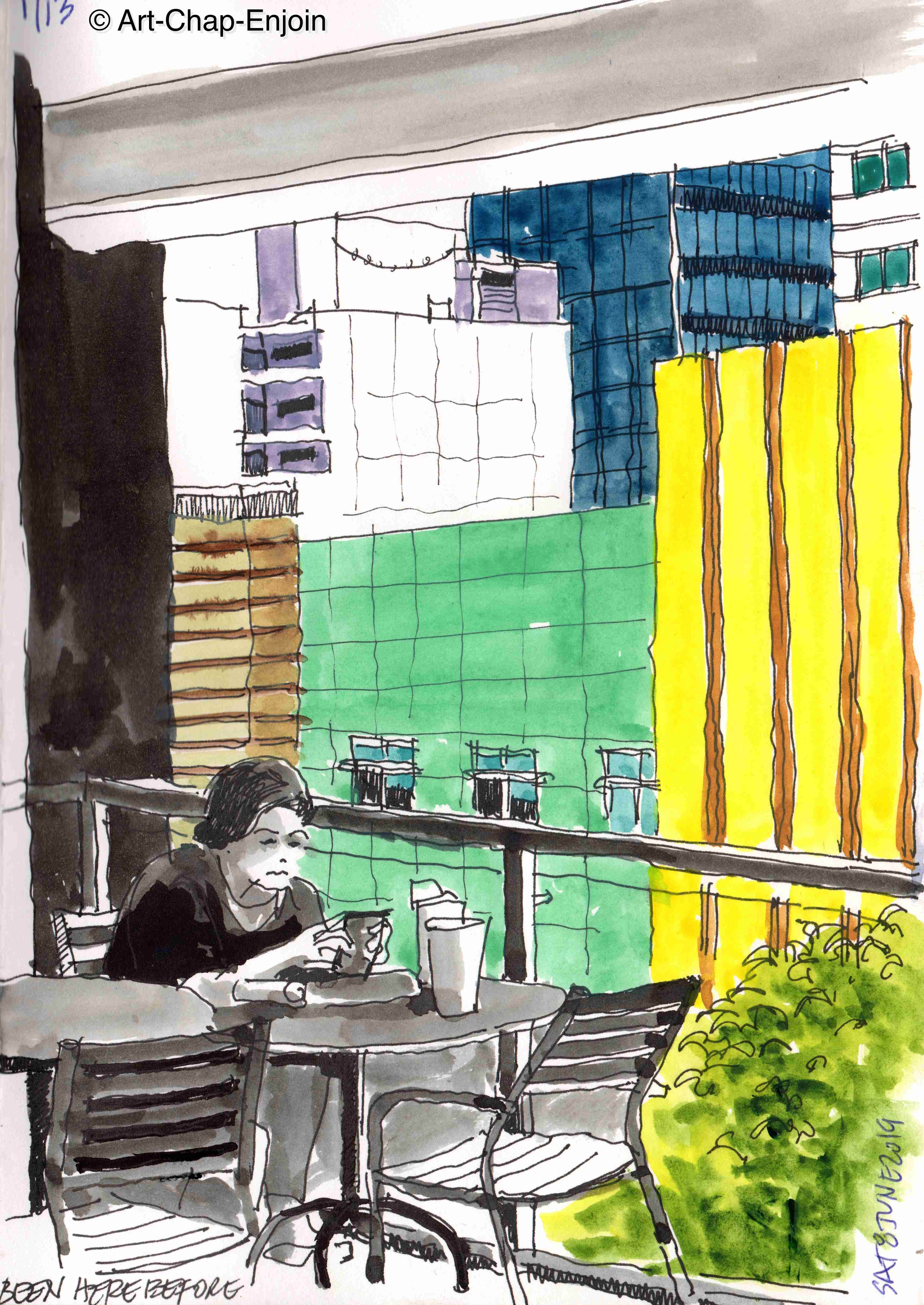 On Saturday I took a break from doing our weekly shopping at Starbucks in the Fully Booked bookshop in Global City. As I sat down I realised I have sat (and sketched) in the exact same spot before…but that didn’t stop me drawing the same scene again…this time with a different person sitting on the balcony of course.