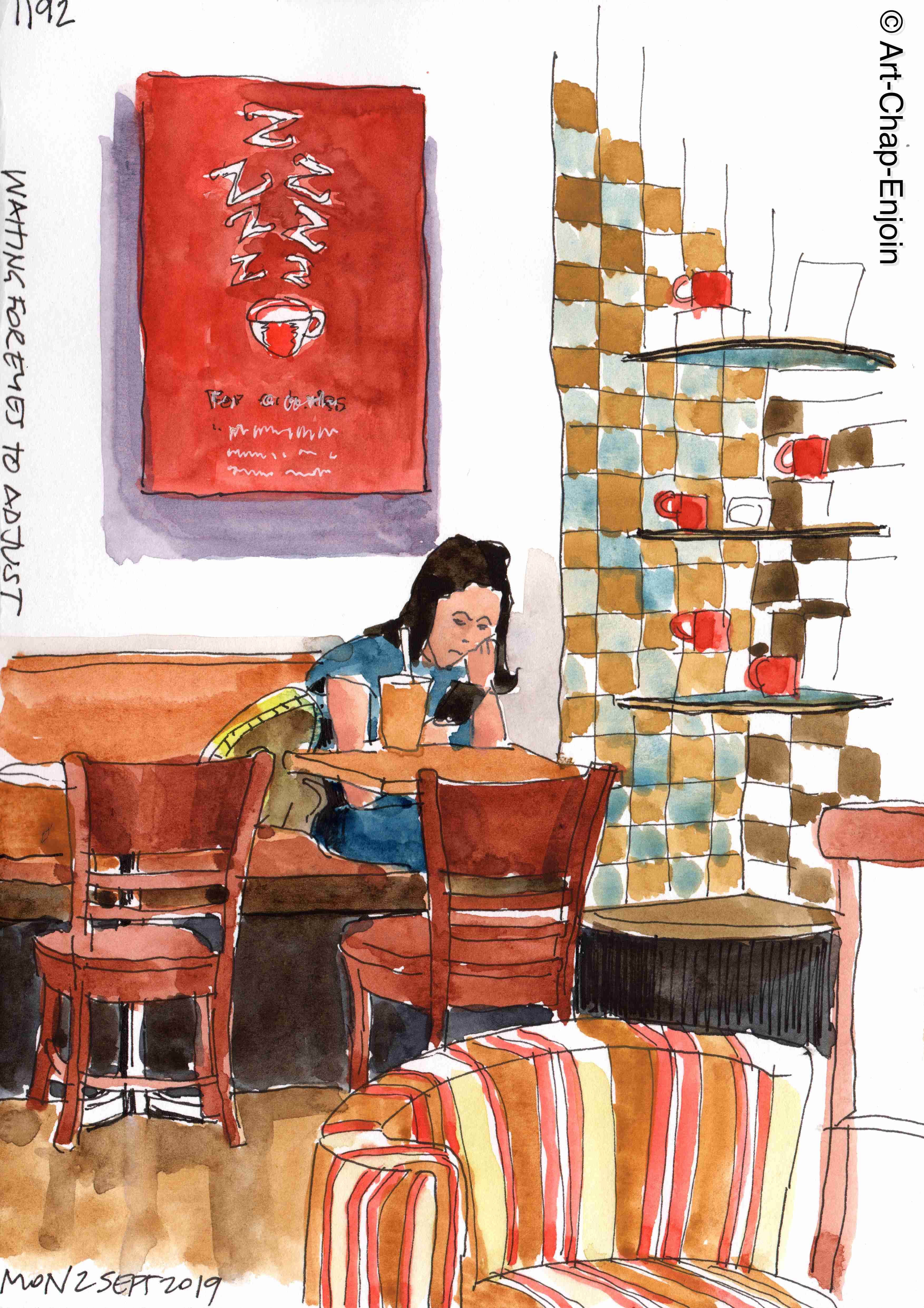 Monday last week I took my daughter to get new glasses – but apparently if you have contact lenses in you can’t get your eyes tested straight after taking them out…you have to wait at least 30 minutes. Didn’t know that! So it was off to the coffee shop with my daughter (who was practically blind without glasses or contact lenses) and of course a sketch.
