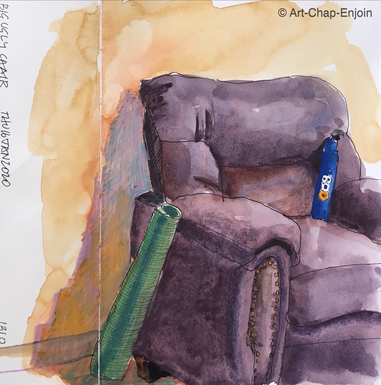I sketched this while winding down in the evening, trying to summon up some energy to do some work on another project – but failing. The furniture here is that perfect dirt colour – so nondescript that you’d never know if it was dirty.