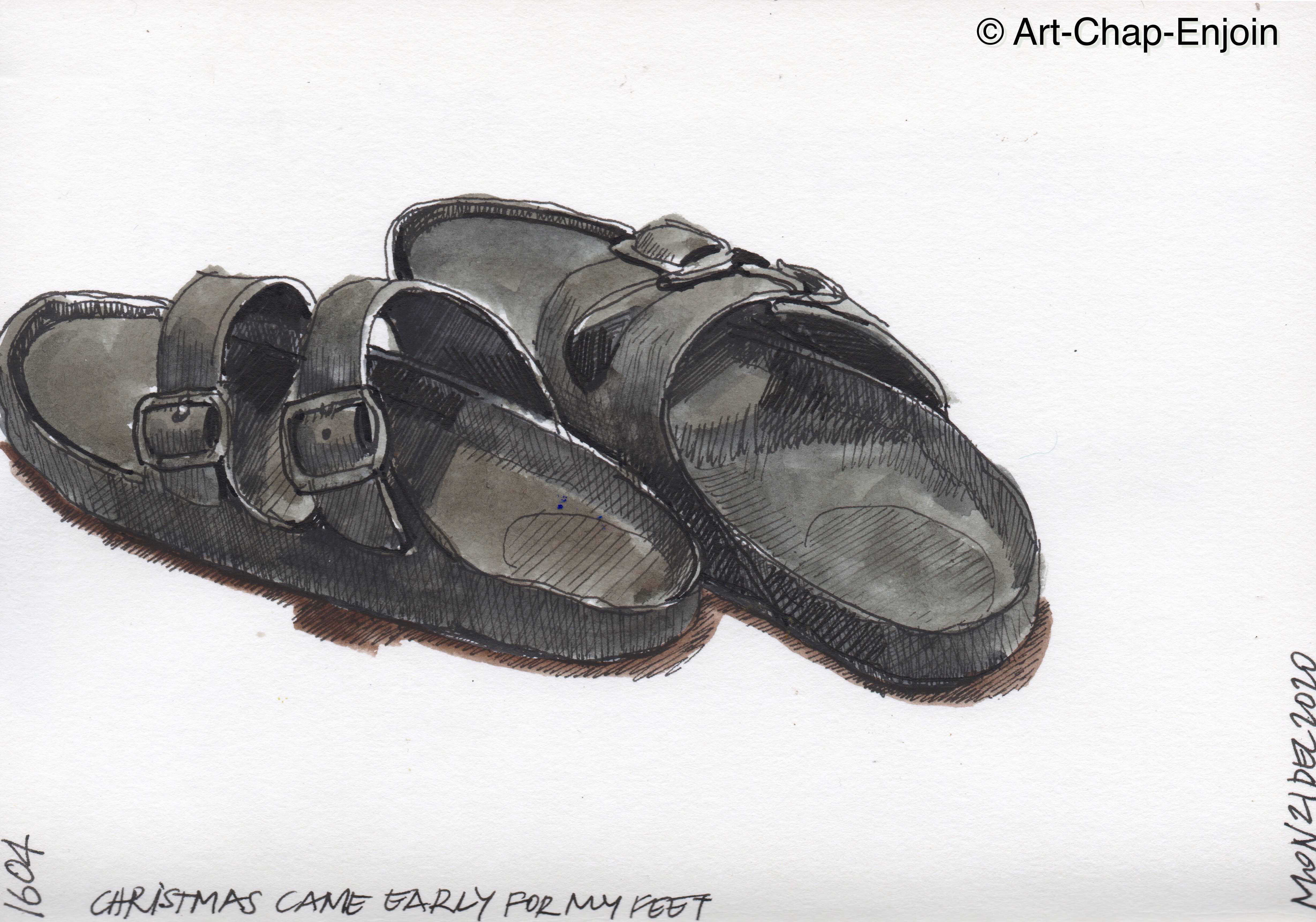 On Sunday, when we were at the mall, we bought my Christmas present and I have been wearing them ever since – Birkenstock slippers for wearing around the house. Very comfortable and supportive. Happy Christmas to everyone who follows my daily sketches – looking forward to a New Year when we can go out without a mask!