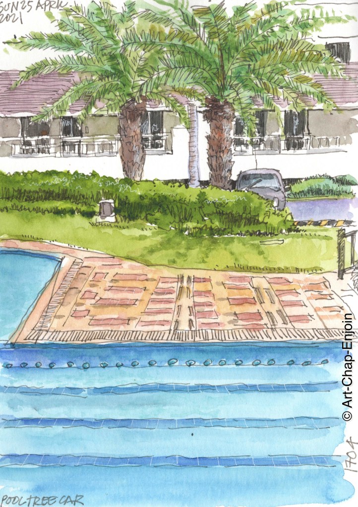 Sunday was Zoom sketching day again with my online friend #TheArtofBeingPresent. I take our sessions as encouragement to get out of the house, at least as far as our common garden and swimming pool – though with the pandemic still raging here I’m not going any further. Anyway here is the sketch I did – another drawing of one of the swimming pools, done while I sat in the shade of a cabana.