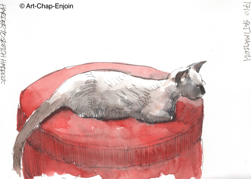 Here is my first sketch of our new cat, Captain Haddock. Our older cat, Tintin, isn’t quite best of friends with him yet (he’s a little bundle of energy and Tintin just wants to snooze all day…who doesn’t?) but she is learning to tolerate him. Haddock is harder to sketch because of his silvery brown colouring…plus he doesn’t stay still for more than a few minutes!