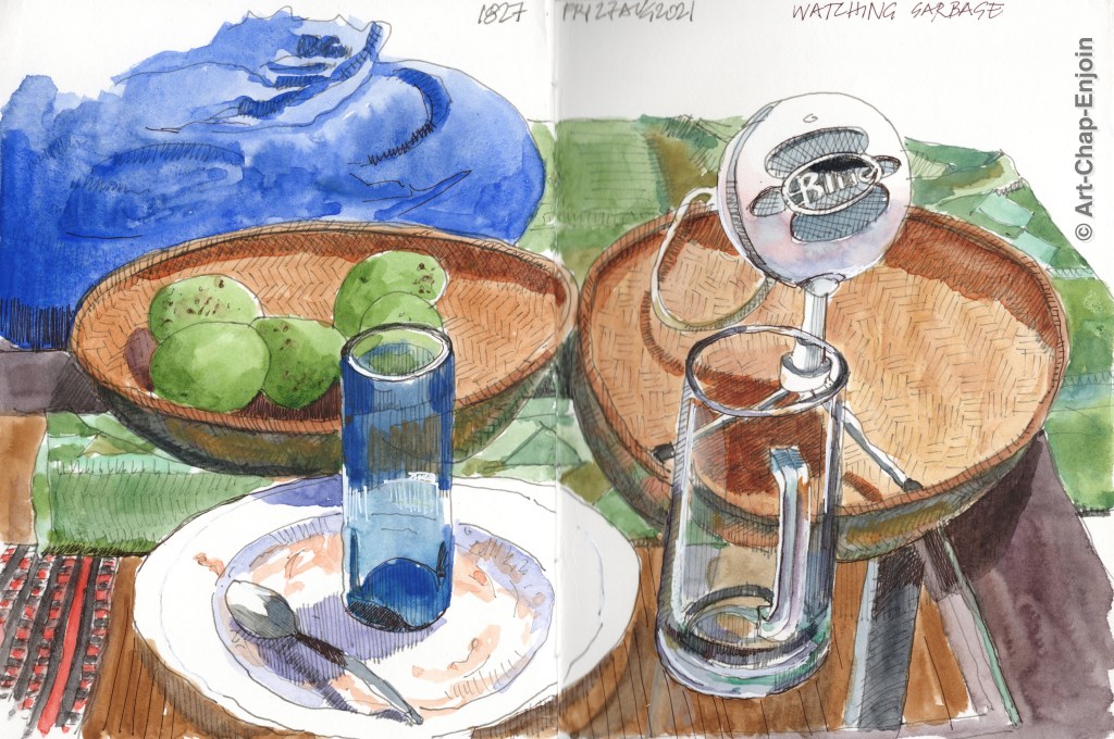 I was in the mood for a nice double spread sketch last night, so I just sketched what was in front of me. As I was doodling away I had the TV on in the background with some rubbishy monster movie playing…for the life of me I can’t remember what it was, I just know it was trashy.