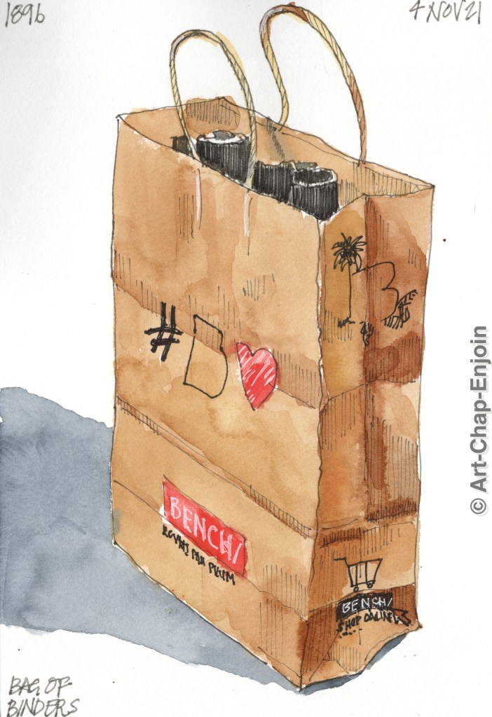 This sketch is a memento of my wife finishing her third (and final) submission for her masters in Social Enterprise Development (on Wednesday 3rd). I helped out by binding up three copies of her business plan – we were toiling away into the evening to get it sent off, so I missed a day sketching and did this the following day when we just chilled out and binge watched a bit of TV.