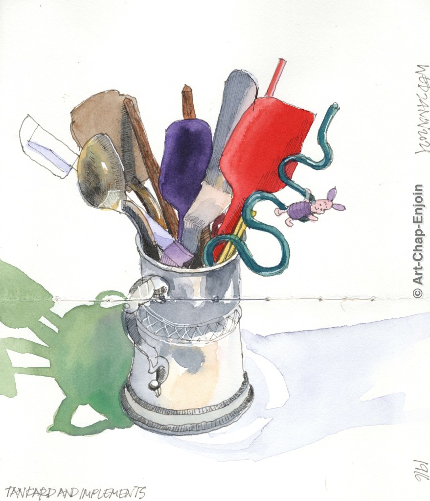 This tankard (pewter I think) sits on our worktop with all the kitchen implements that are not wooden…well not all, there are some chopsticks (made from ancient coconut wood I think) that have worked their way into this. I think the tankard was given to me by my sister for being an usher at her wedding? So long ago that I have forgotten. No doubt I will get told off if my memory has failed me (as usual).