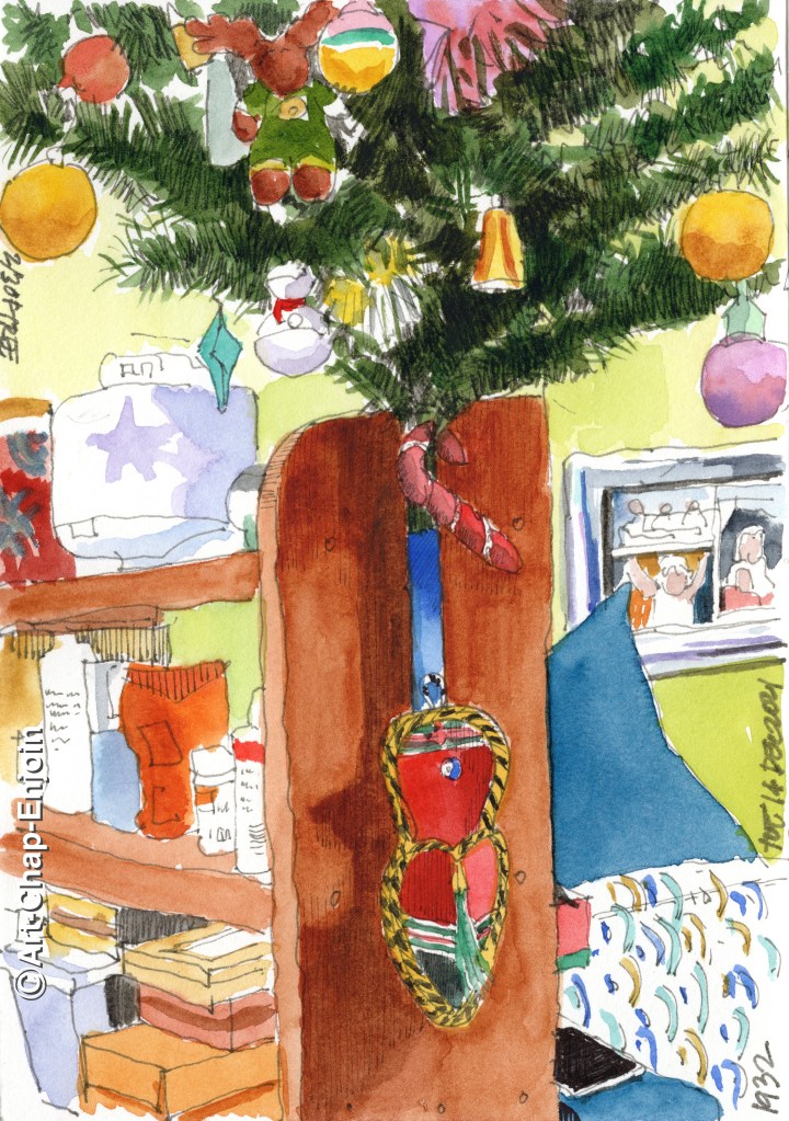 This sketch is of our nice old Christmas tree – well the bottom of two thirds of it. Last year we only managed to stand 1/3 of it on top of the shelf, this year we hit upon the idea of strapping it to the side, stuffing the tubular trunk into a bit of old plastic piping (which is screwed to the shelf). It worked perfectly and is only slightly drunken, instead of almost toppling over like it was last year.