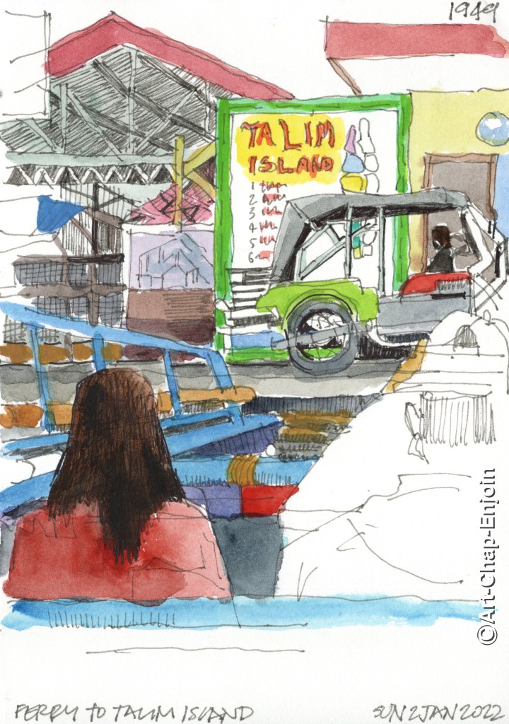 Here is the sketch I did while we were on our way to Talim Island on Sunday. We got on to the ferry only to have to wait for almost an hour before it set off. Unfortunately I started this sketch a bit late and couldn’t finish it on the spot. There was a figure to the right and some other part of the boat which didn’t appear in the photo I took, so I just left that part blank.