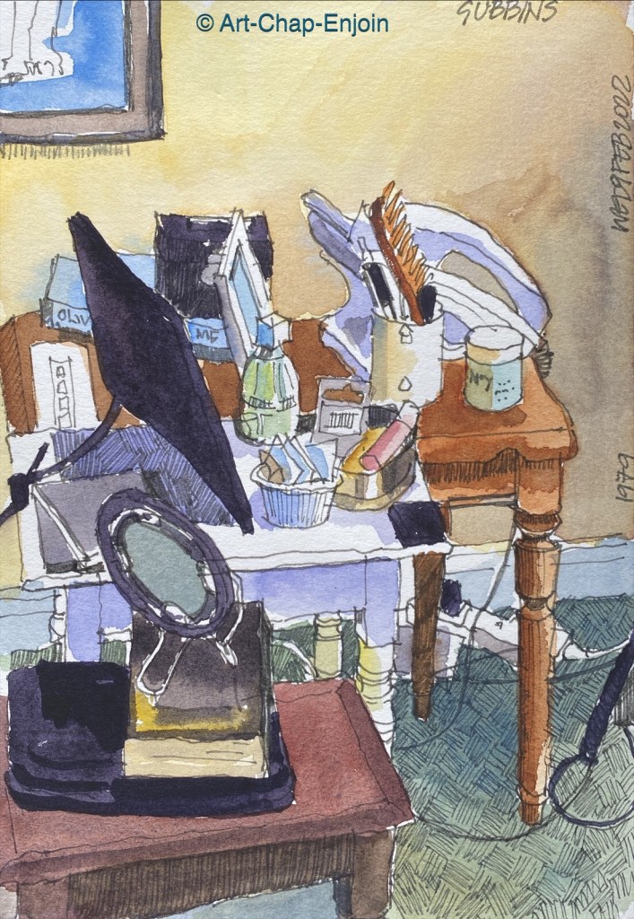 Here is another sketch done while visiting my mums (this was on our third day in the UK, after we had been to Bury St. Edmunds to visit my favourite art shop). This view is of all the little tables and stuff next to where my mum sits. According to Google, gubbins means miscellaneous items or paraphernalia! The big black thing is a digital picture frame.