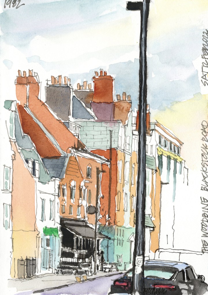 Here is one of my belated sketches from our trip to the UK – which I just added the colour to, from a photo. I sketched this on our walk back to our daughter’s flat (while she and my wife did some shopping) after having spent our first full day in London visiting the Tate Modern and the Portobello Road market. I sat outside a coffee and bookshop called “book bar”, braving the cold. The Woodbine is the black canopied shop-front, and is an Irish pub.