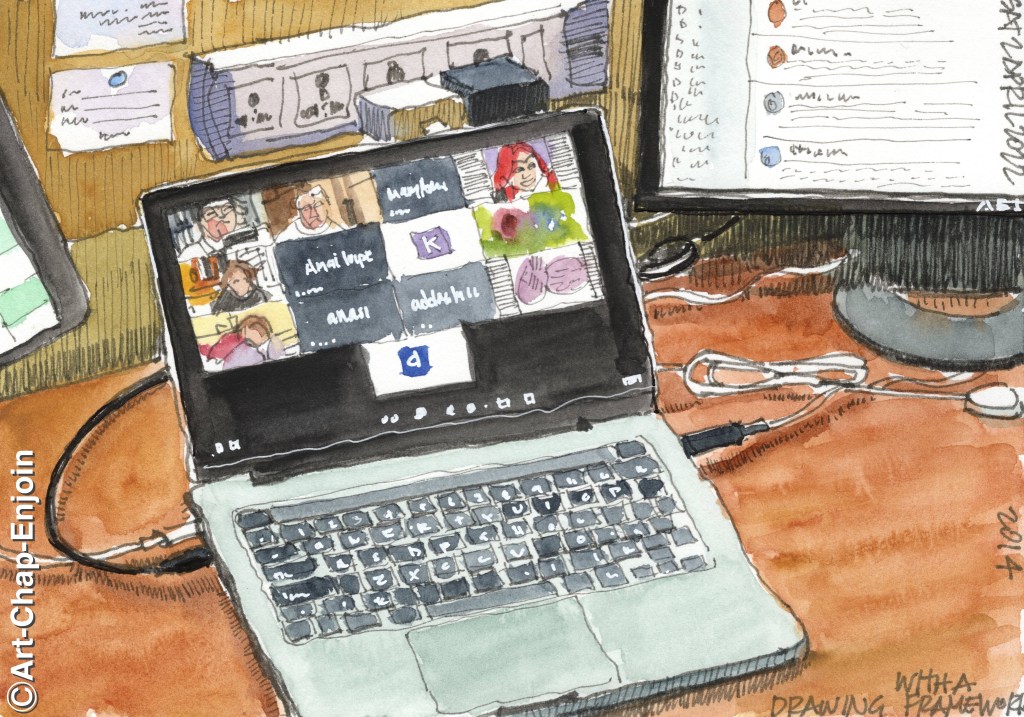 Yesterday I joined a #UskPh on line learning session on how to draw large, complicated urban and architectural scenes – run by Janeil Arlegui. While I was listening and watching, I sketched this. I have been sketching for years and usually start from the middle of what I want to capture and work my way outwards. However I am always open to a new approach – and next sketch I will try using a framework to sketch a bigger scene.