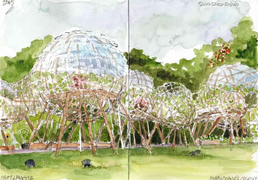 Last Saturday I joined #UskQuezonCity for a sketch-walk at Ateneo Art Gallery where a we sketched this installation by Leroy New. Mebuyan is a goddess of death and fertility in Bagobo mythology (the Bagobo are one of the largest groups of indigenous people in Southern Mindanao). It consists of lots of spheres made of bamboo and steel, filled with plants and vegetables growing in planters, which you can walk through (on the far right of my sketch are some steps which take you up into the installation). It was a really tricky thing to sketch!
