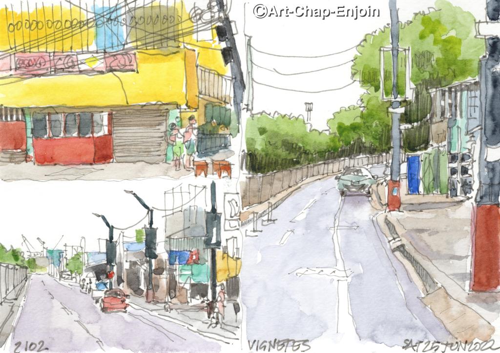 Last Saturday I wasn’t able to join the #UskManila sketch-walk because we spent our morning canvassing prices for some new railings to go on our balcony. While my wife hopped out of the car at various points (it’s best for a foreigner like me to stay out of sight as the price would go up immediately if the supplier saw me), I did some little thumbnail sketches of my view. I painted them when I got home using a photo taken for reference.
