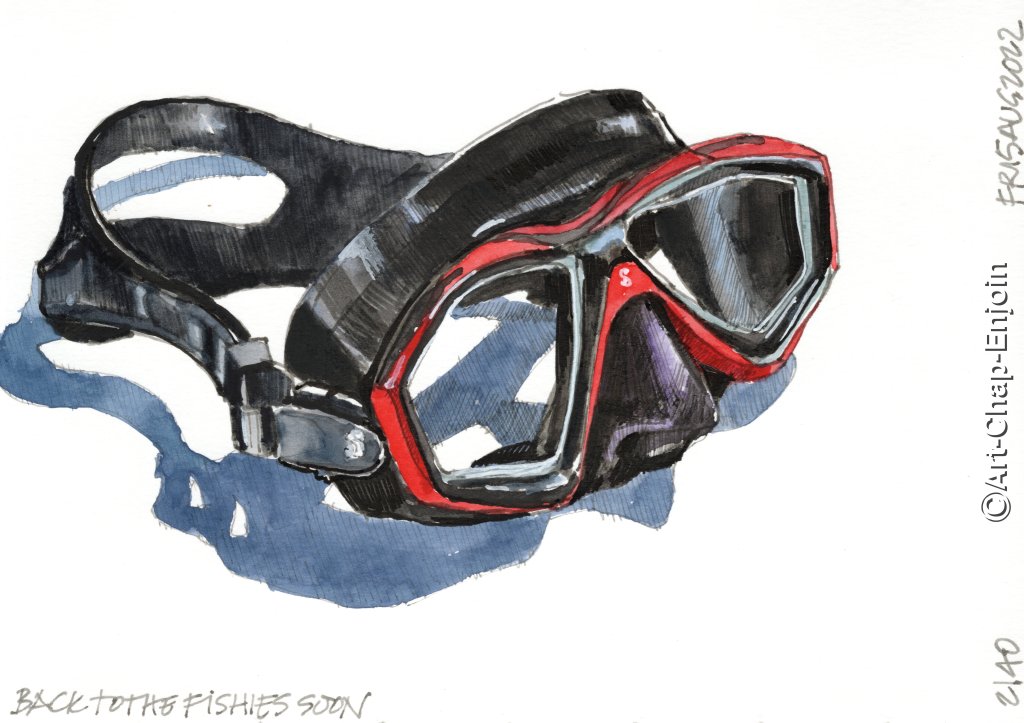 Last week I bought myself a face mask and snorkel, in preparation for an upcoming visit to the beach (again). I often sketch new things I get – this one was a challenge because it’s mostly black and shiny.