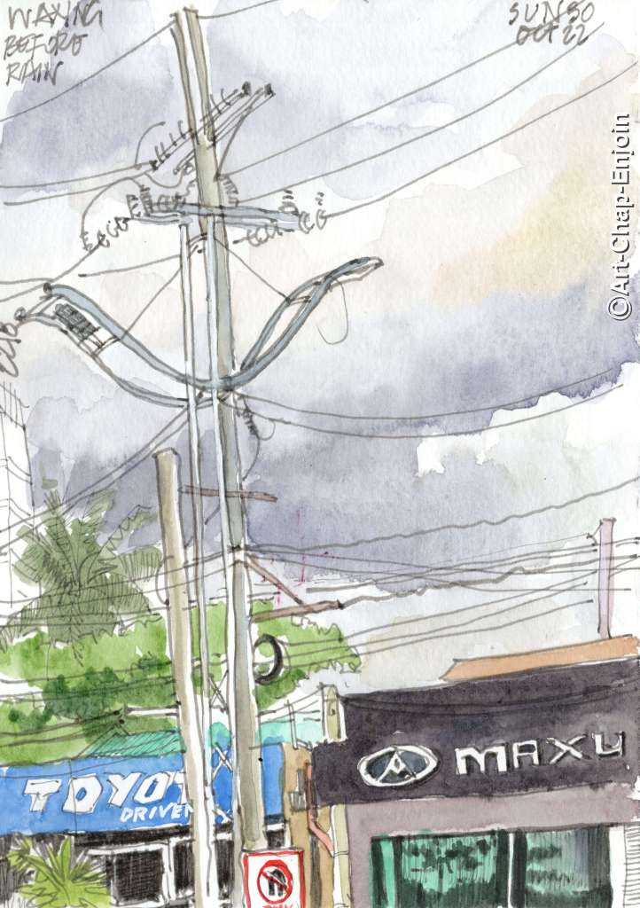 Car washing and rain do seem to go together. Wonderful drawing of Nature’s rain-filled clouds descending on human commerce!