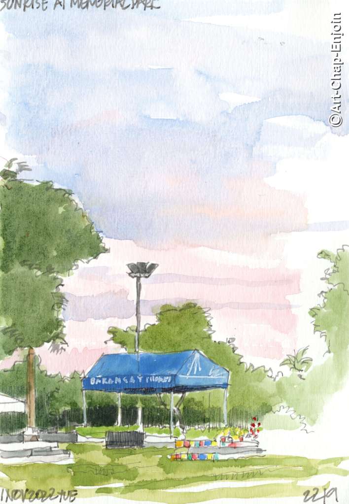 I spent last night at the memorial park where my wife’s parents are buried. It’s All Souls’ Day today and the custom here is to spend the day (and the night I guess) visiting the graves of your loved ones. The idea is to say prayers – but it’s also a family gathering. I drew this when I woke up.
