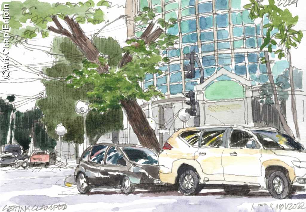 This morning, after dropping my wife off at the French visa facilitating services office, I had a while to sketch in Makati. I wasn’t clamped but the white car in front of me was while I was sketching this. Meanwhile my wife was paying a massive fee and submitting, hundreds of supporting documents, to get a Schengen visa. For Europeans to travel to the Philippines, you just get on a plane and show up… and you get a visa on arrival for free.