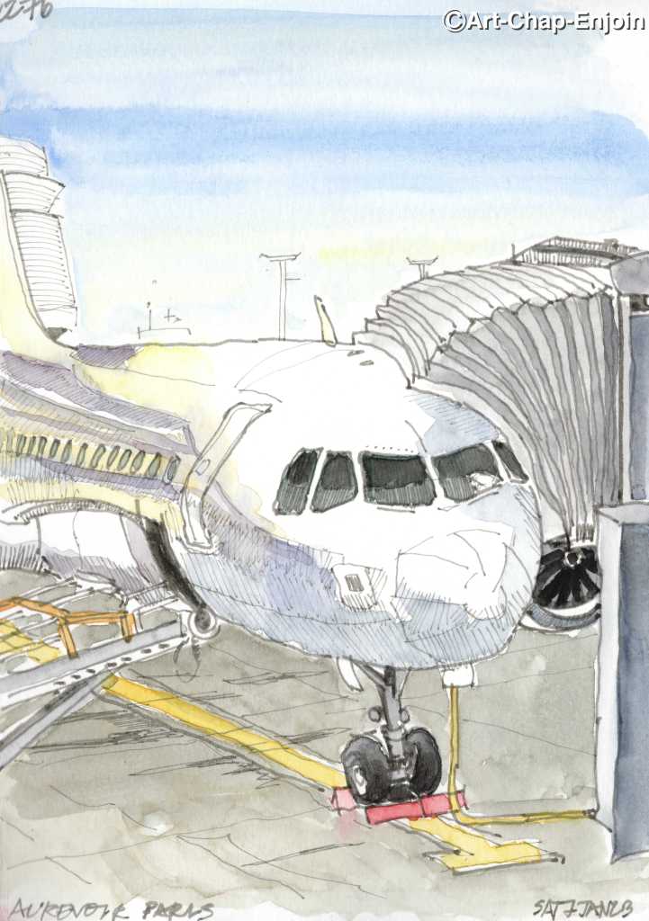 Here is the last sketch I did in France – naturally at the airport (Charles de Gaulle), which is pretty fancy. This wasn’t our plane but I could see it easily when we found a nice spot to sit.