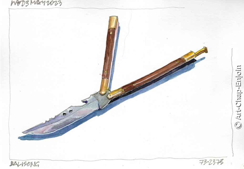 After our sketching with #UskQuezonCity in Taal, the local government very kindly gave us all a certificate of appreciation and gift for participating in the #Elpasubat2023 – unexpectedly generous of them. The gift was a balisong knife (also called a butterfly knife) which according to the blurb on the presentation frame was made in Taal and depicts the Filipino spirit of unity and cooperation. I took mine out of the presentation frame to use it to open a bottle of beer!