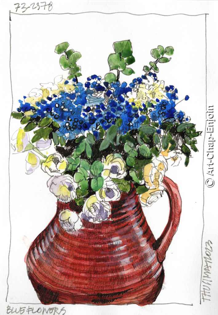 This is yet another vase of plastic flowers from our landlady’s apartment. I think there may even be one more somewhere. Real flowers are nice of course, but the plastic or silk ones are still fun to draw.