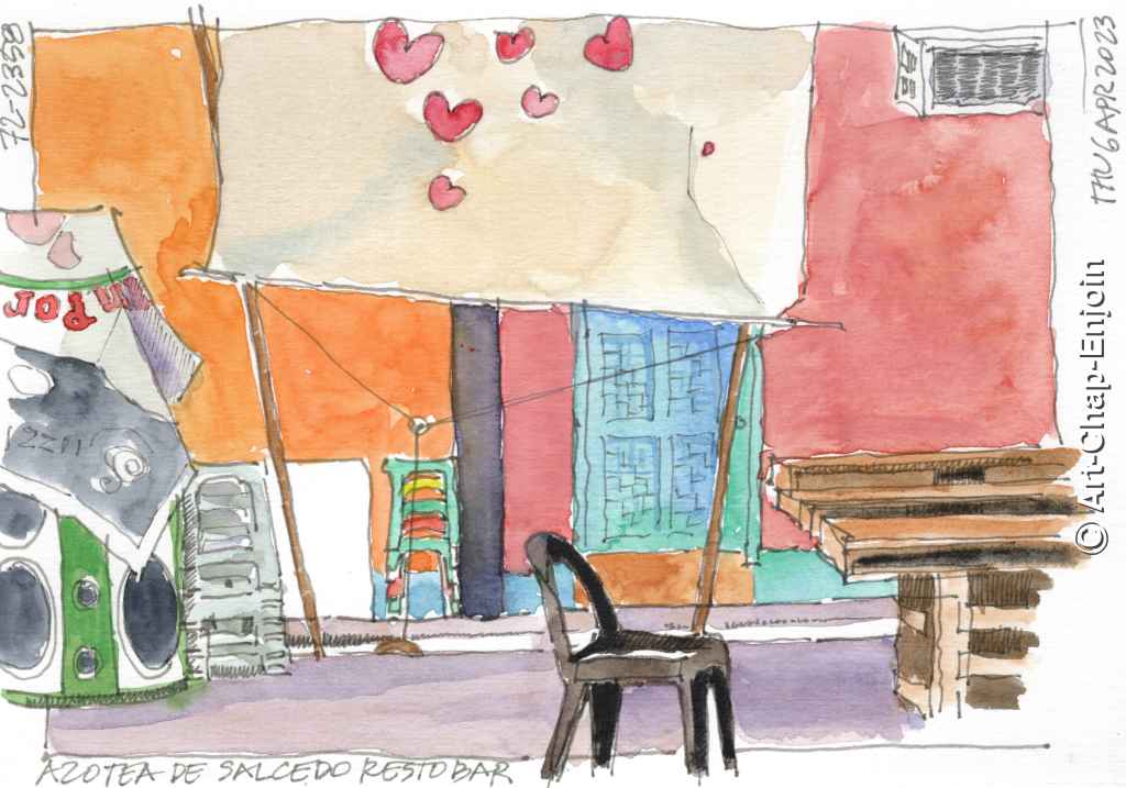 Here is another sketch that has been languishing partly finished in my sketchbook. This one was done after we had been to Mantigue Island offshore from Camiguin. We had dinner at a little resto-bar right at the drop off point of the port. To the left is an all essential karaoke machine.