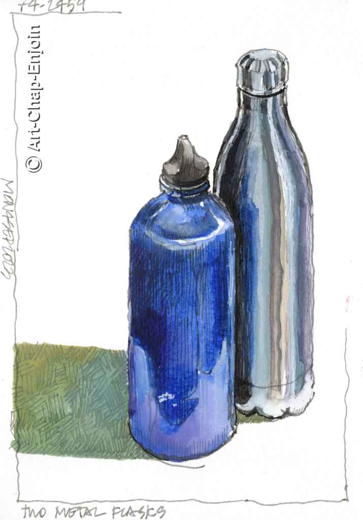 I am always on the look out around our house for something to sketch – and then I just file it in my memory bank for an evening sketch. So I saw these two metal flasks standing together and liked the way one reflected in the other. At some point I’ve probably sketched both of them (after all I have sketched most objects in our house)…but I don’t care…it’s just good practice.