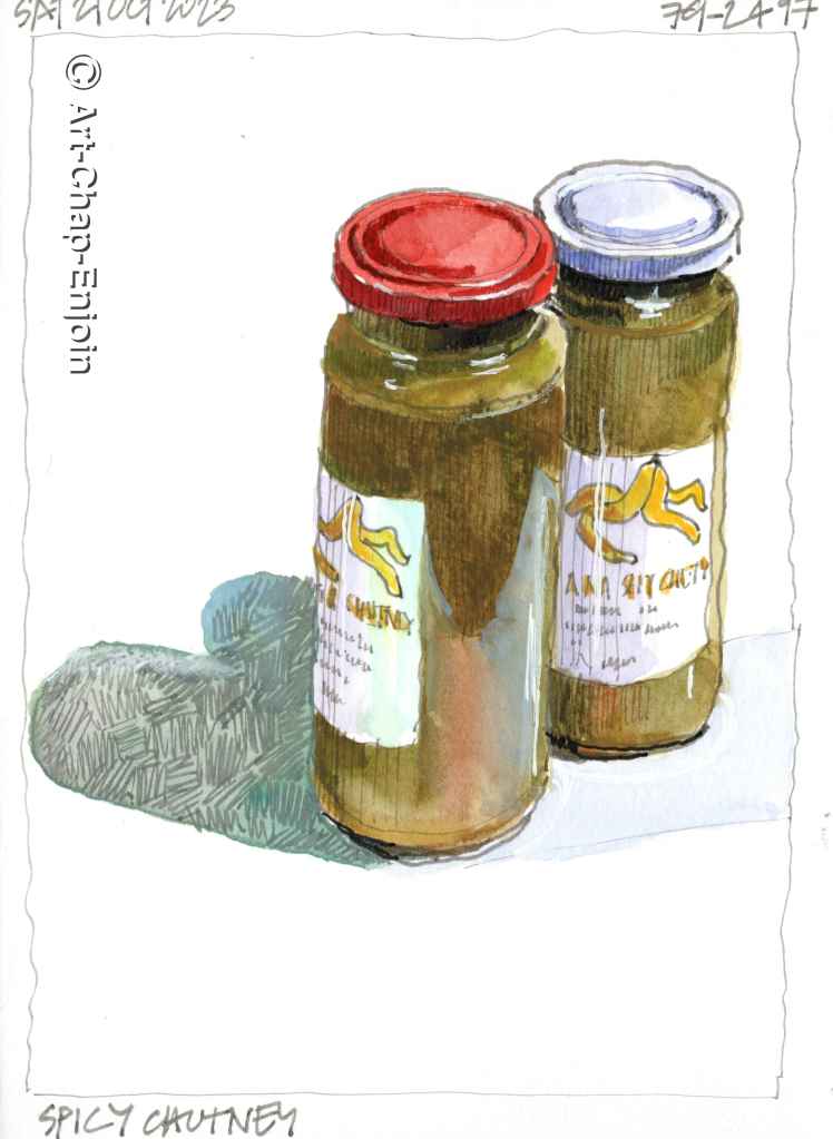 For this sketch I switched to the #Inktober2023 prompt for Day 12 of ‘spicey’ (I guess that is an American spelling), instead of the #Sketchtober2023 prompt of ‘tree’ – seeing that I wasn’t out and about. The day before I drew this, I had made these two jars of chutney using overripe bananas and their skins (along with lots of spices, chillies and some onion). I’d read this article (maybe in the Guardian) about zero waste and thought I would give it a try. It’s yummy!