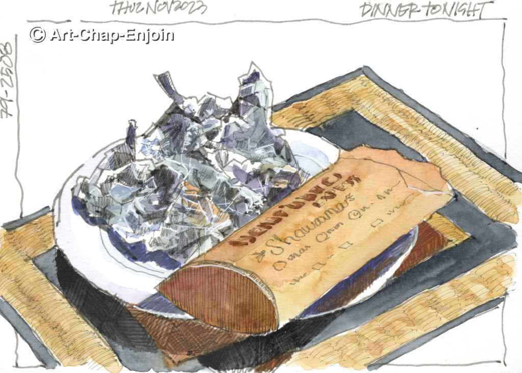 Here is another #Sketchtober2023 effort following the prompt of ‘meal’ for Day 18. Beiruti Bites (a fast food place specialising in Shawarma) is a good choice for a vegetarian meal – mine was a “challenger” size falafel sandwich. I struggled to sketch the crumpled up tin foil for this one (it kind of ended up looking like a rock?) – that was the second challenge!
