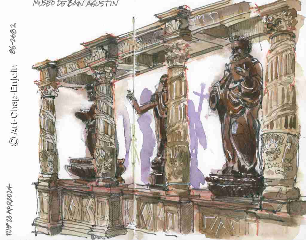 For the second part of our afternoon off on 23 April in Intramuros, we joined #UrbanSketchersManila at the San Agustin Museum for the Unesco World Book and Copyright Day, hosted by the UNESCO-Philippine National Commission. The museum has an amazing collection of religious artefacts, housed in a former monastery, with beautiful courtyards (I could sketch there for days). In my sketch the figures at the ends are St. Augustine and St. Paul (17th century Molave wood from Sexmoan, Pampanga …yes that is a real place), and in the middle is a 20th century Risen Christ. The museum notes didn’t say anything about the wooden altarpiece.