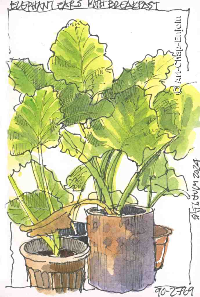 This little sketch was done outside the #BrewHilde coffee shop down the road from us, when we went out for a walk and breakfast on my wife’s birthday morning. I’ve sketched here many times before, but this time these plants caught my eye – they are commonly knows as elephant-ear plants but the scientific name is Colocasia.