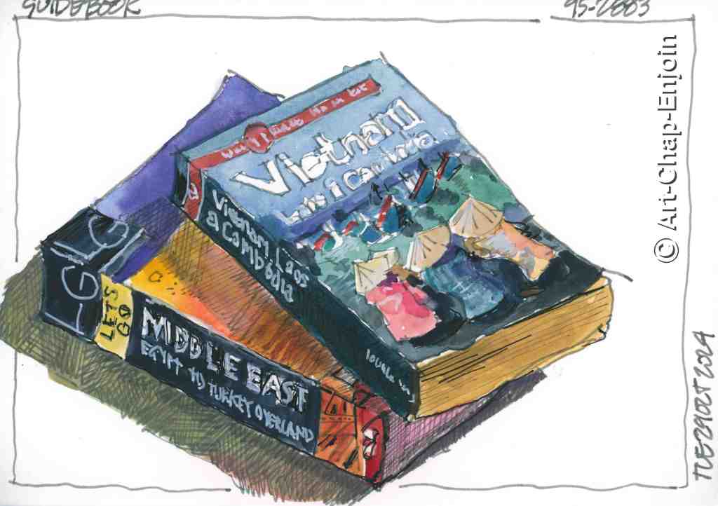 Trying (hopelessly – it’s already November now) to catch up with the #Inktober prompts, I followed the prompt for Day 14 of #Inktober2024 very literally, by sketching some old guidebooks we have. These are the Lonely Planet guide for Vietnam, Laos and Cambodia and the Let’s Go guide for the Middle East – both parts of the world where I have had the privilege of working.