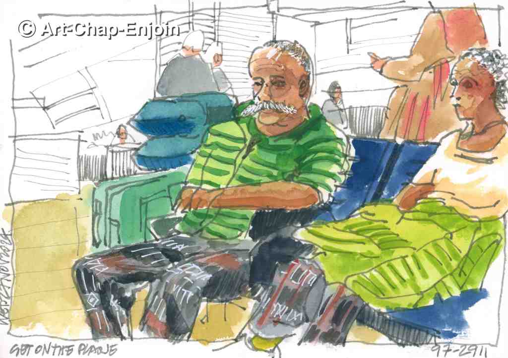 After my snooze at the airport in UAE I woke up with only a few hours to go before my flight, so I only managed this quick sketch at the gate, before boarding. This elderly couple appeared to be travelling the world together – they were wearing matching baggy trousers and had similarly coloured puffer jackets. What a fantastic moustache the guy had (my sketch is not an exaggeration)!