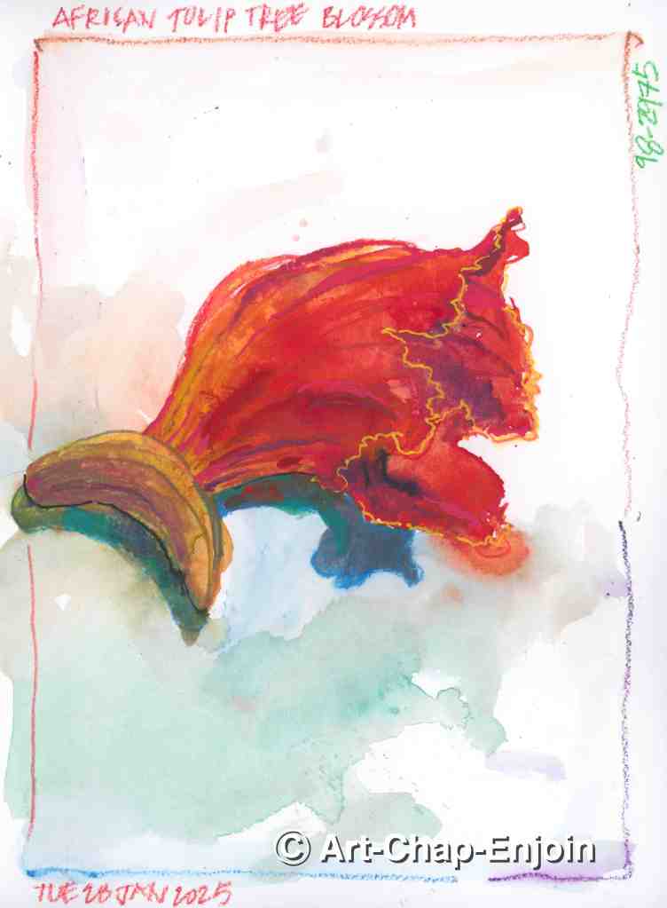 I picked this blossom up near our apartment and thought that the colours are so beautiful that I had to try and sketch it. I used watercolour pencils, watercolour, a tiny touch of ink and a yellow Posca pen to do this one. According to Wikipedia the tree has been nominated as among 100 of the “World’s Worst” invaders – it is not native to the Philippines but is widely planted as an ornamental tree.