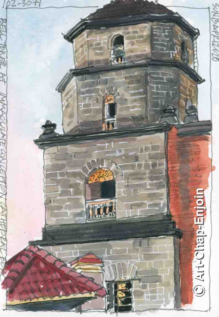 After lunch (yummy miso soup) on our first day in Marinduque we went into Boac for a wander and visited the cathedral. It looks ancient on the outside but is modernised inside. According to the internet the cathedral was built in 1792 and served as a refuge against pirate attacks and during times of conflict like Moro raids in the Spanish colonial period. Several websites say the tower is built of “Adobe Stones” – i.e sun dried mud bricks, but to me it looked more like sandstone. While I sketched this, people came out of mass and looked at what I was doing, making friendly remarks, while my wife wandered about testing out the settings on her camera.