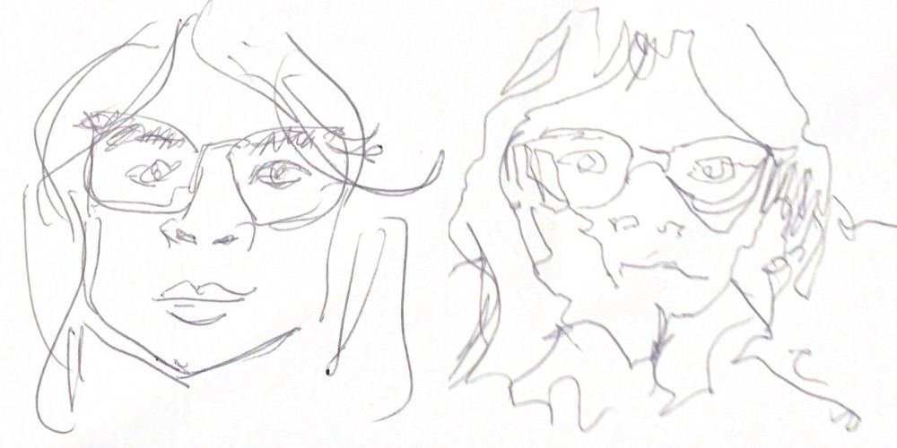 This sketch was done on our last full day in Hove/Brighton starting with a visit to Art in the Park (in St. Anne’s Well Gardens, Hove). Then lunch from Pompoko…where there was nowhere to sit so we sat in the park – and I sketched this (I used washi tape to mask the edges for a change). The rest of day involved visits to “Artists Open Houses” – part of Brighton Festival, which was very inspiring. When we stopped for a break at Pelicano Coffee Co. in the Lanes we also had a go at doing one minute sketch of each other…and I’ve added these to this post.